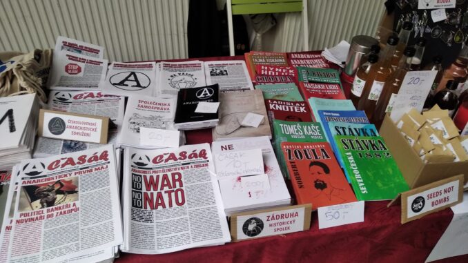 V sobotu 18. 5. 2024 jsme s naším distrem ČAS navštívili Dny antikapitalismu v Praze. Kromě materiálů ČAS (našeho anarchistického zpravodaje, letáků, první publikace Anarchistické knihovny ČAS a samolepek), jsme distribuovali Domácí sirupy Solidarita, semínka Seeds not bombs, benefiční handmade bižuterii Meadow Bijoux a publikace historického spolku Zádruha. Pořádáš akci, například koncert, jsme ti sympatičtí, pozvi nás na ní, rádi přijedeme s naším stánkem.