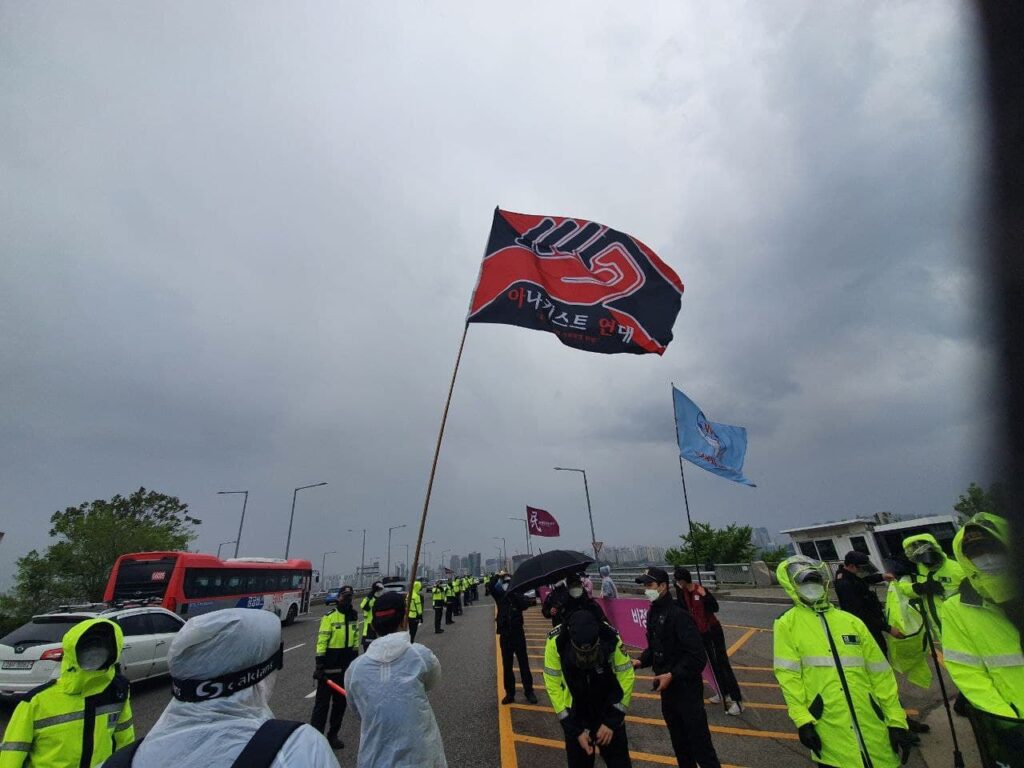 Proto vedeme tento boj proti „lhostejnosti“ účastí na co největším počtu masových akcí. Přitom s sebou máme naši vlajku v co možná největší velikosti, s nápisem „Anarchistická solidarita“ v největším možném písmu. Není to proto, že se předvádíme. V Koreji se hromadné demonstrace s účastí 10-100 tisíc lidí konají několikrát ročně. Je to už 10 let, co jsme se na těchto demonstracích účastnili individuálně, ale nikdy jsme na nich nezahlédli žádnou „černou vlajku“. Proto s sebou máme tu velkou vlajku. Snažíme se dát lidem vědět, že „anarchisté mohou skutečně ovlivnit transformaci společnosti. Anarchisté mohou stát bok po boku s lidem.“