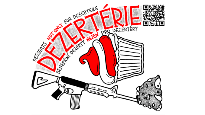 Dezerty a dezertéři: Dvě oblasti propojeny v jednom projektu. Dezertérie spojuje vášeň pro dobré jídlo s odporem proti válkám. Nabízíme mufiny, lívance, koláče, koktejly a jiné dobroty. Vše veganské a za dobrovolný příspěvek. Veškeré vybrané prostředky podpoří dezertéry. Proč zrovna je? Protože dezerce je konkrétní formou vzdoru proti válkám. Protože dezertéři oslabují schopnost armády ve válce pokračovat. Protože podpora dezerce je projev internacionalistické solidarity. Protože války mohou pokračovat jen pokud jsou lidé ochotni válčit a dezertéři jsou tedy jako zrnka písku sypaná do soukolí válečné mašinérie. Díky nim to celé drhne a může se to i zastavit.