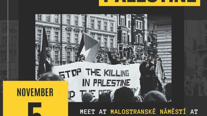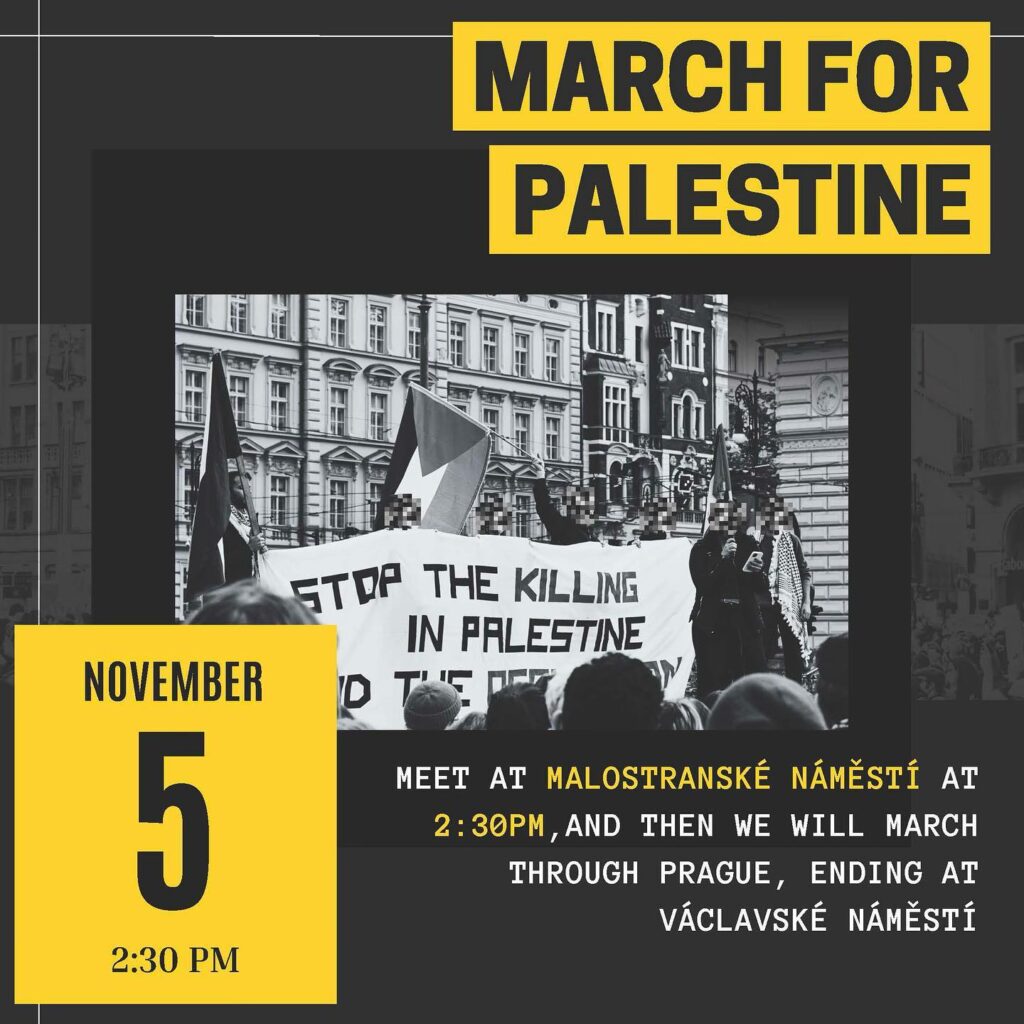 Join us this Sunday, November 5th, at 2:30 pm in the heart of our city at malostranske namesti. Let’s march together across the center, spreading awareness and standing in solidarity for the Palestinian cause and for our fellow siblings in Gaza. 🕊️ This is our opportunity to make our voices heard, to shed light on the ongoing struggle, and to advocate for a future where every voice counts.