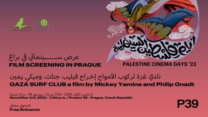 As the suffering of the Palestinian people is consistently downplayed by major media outlets and shadowbanned on social media, we are expanding our channels to support the Palestine Cinema Days Festival. The original festival, which takes place in Palestine, was forcibly canceled due to the current escalation of violence. That’s why we have decided to organize it worldwide in order to challenge the distorted narrative that dehumanizes Palestinians.One day after the anniversary of the Balfour Declaration, a pivotal moment in the history of Palestine, and as part of our efforts to amplify Palestinian voices, we will be screening „Gaza Surf Club,“ directed by Mickey Yamine and Philip Gnadt, at 7:00 p.m. at Prostor 39 in Prague, Czech Republic. The screening is free of charge. After that, there will be a Q&A with PhD. Yasar Abu Ghosh, a Palestinian socioanthropologist. The subtitles are in English as well as the Q&A part. Film synopsis:Trapped in „the world’s largest open-air prison“ and ruled by war, a new generation is drawn to the beaches. Sick of occupation and political gridlock, they find their own personal freedom in the waves of the Mediterranean – they are the surfers of Gaza.
