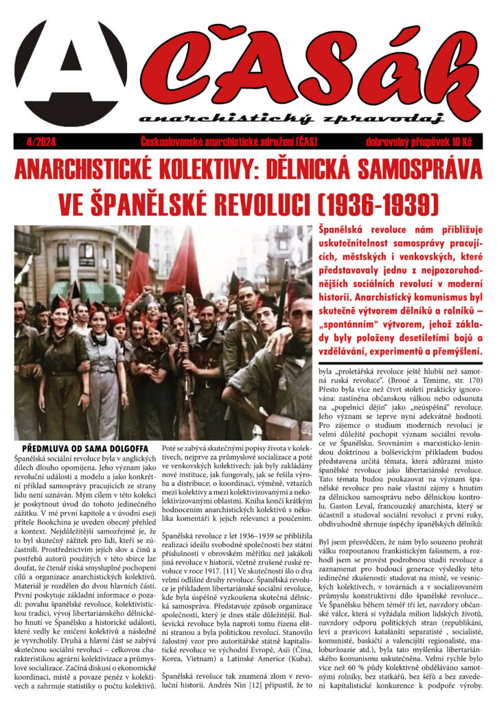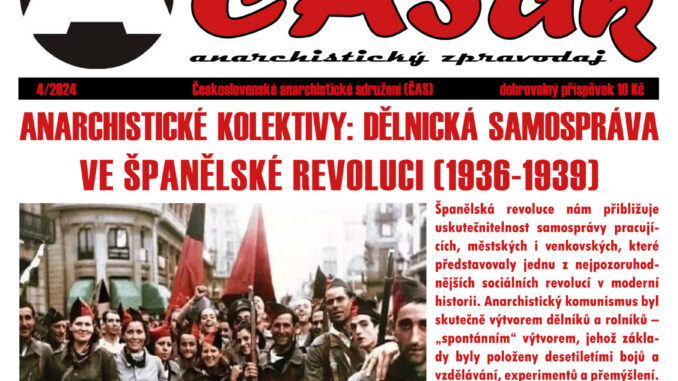 Připravujeme speciální číslo našeho anarchistického zpravodaje „ČASák“, které se bude věnovat španělské revoluci (1936 -1939) a anarchistickým kolektivům v zemědělství i průmyslu jako ukázce dělnické samosprávy, která fungovala. Jejich příklad potvrzuje naše tvrzení, že lidé dokáží spravovat svá zaměstnání bez šéfů k vlastnímu prospěchu a vytváření blahobytu pro sebe, své blízké a celou společnost. Anarchokomunismus funguje. Nové číslo výjde začátkem července k výročí 19. července 1936, kdy se španělská dělnická třída postavila fašistickému puči a začala realizovat nový svět.
