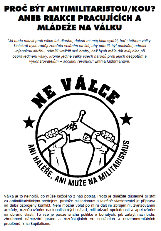 Válka je to nejhorší, co může každého z nás potkat. Proto je důležité důsledně si stát za antimilitaristickým postojem, protože militarismus a falešné vlastenectví je příprava na další ozbrojený konflikt. Není možné volat po míru dalším zbrojením, zvětšováním armády, rozněcováním nacionalistických nálad, militarizací společnosti a apelováním na obranu vlasti. To vše je pouze snaha politiků a bohatých, jak zakrýt naši bídu, zhoubnost námezdní práce a rozrůstajících se sociálních a environmentálních problémů, krizí kapitalismu.