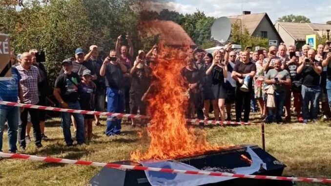 Symbolickým pohřbem krachující ostravské huti Liberty vyvrcholila v úterý 6.8.2024 tragikomická série jednání mezi reformními odboráři a vedením podniku. Naštvaní pracující před budovou ředitelství podpálili symbolickou rakev podniku. V plamenech skončila i fotka jeho majitele Sandžíva Gupty. Naštvání dělníci skandovali: „„Hanba, fuj, hovado!“